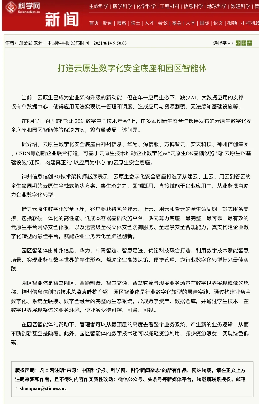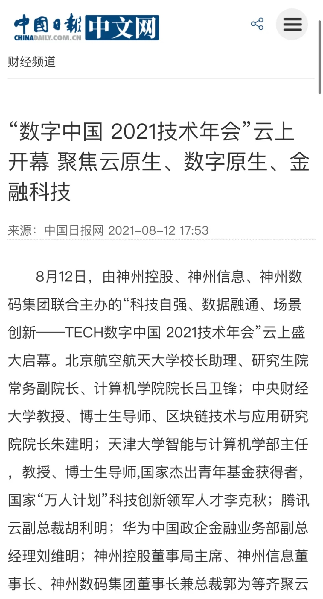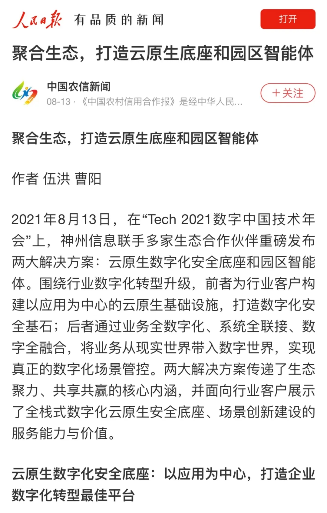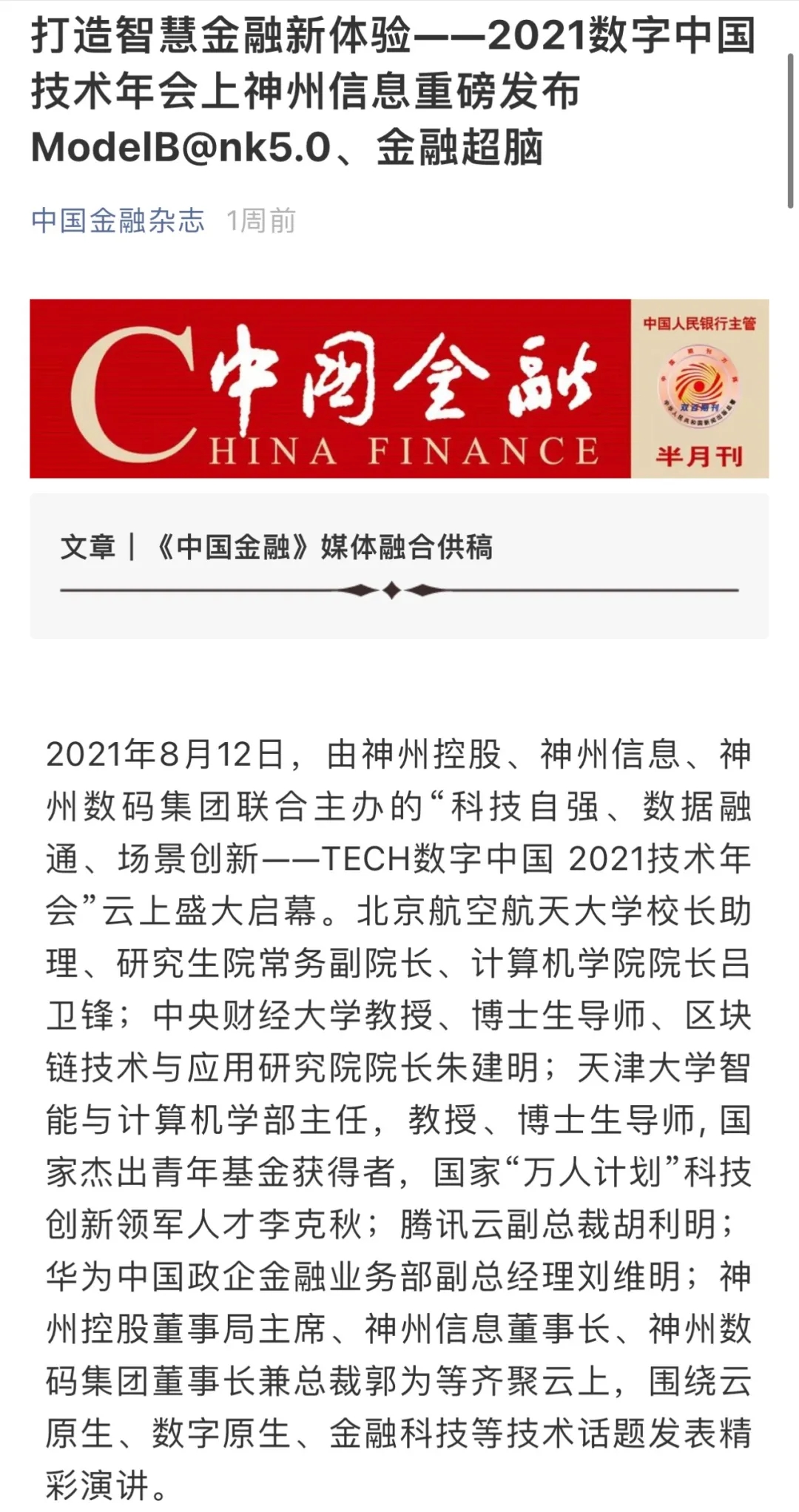 8月12日,由神州控股、神州信息、东升国际集团联合主办的“科技自强、数据融通、场景创新——TECH数字中国 2021技术年会”云上盛大启幕,发布神州信创云、ModelB@nk5.0、金融超脑Sm@rtFSB、云原生数字化安全底座、园区智能体等重磅产品,国内各大权威、影响力媒体多角度多频次对盛况进行报道!